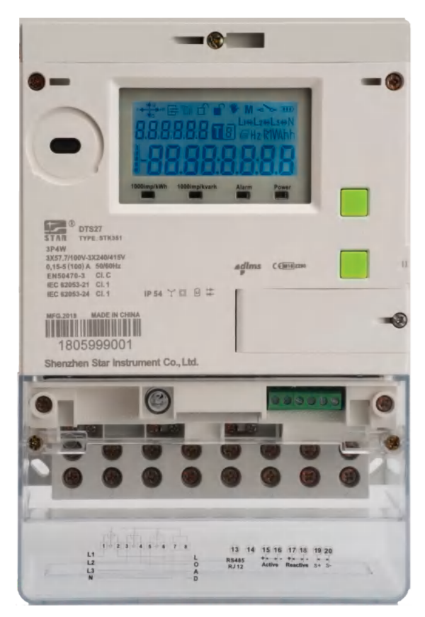 El DTS27 SMART es un medidor de energía electrónico inteligente trifásico, conmutable entre prepago y pospago. Ofrece diversas opciones de comunicación. Su filosofía de diseño se centra en la personalización, la modularidad y la globalización. Además, ofrece alta precisión de medición, flexibilidad de liquidación, multitarifas y un avanzado diseño antimanipulación, ampliamente utilizado en el sector residencial y comercial. El medidor está certificado según los requisitos de la MID (2014/32/UE).